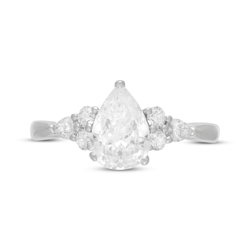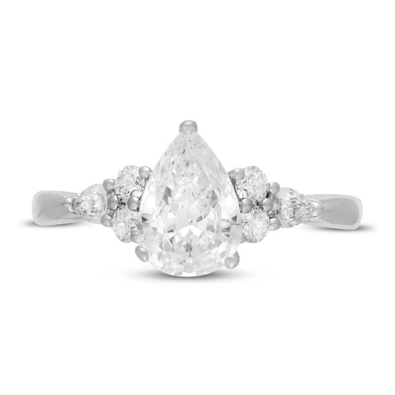 A stunning 1.5-carat, independently-certified pear-shaped diamond dazzles at the center of this beautiful engagement ring for her. Brilliant round diamonds sparkle on each side of the center, and two pear-shaped diamonds shimmer left and right to finish the iconic design. Set in classic 14K white gold, the ring sparkles with 1 7/8 carats of independently-certified diamonds. The center diamond is laser-inscribed with a unique Gemscribe® number for your peace of mind. From the Neil Lane™ Premiere collection.
