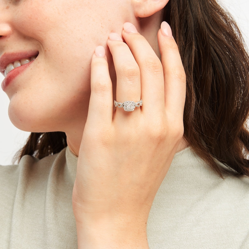 Evoking Hollywood glamour, this stunning engagement ring for her from Neil Lane Bridal® features a princess-cut diamond surrounded by round diamonds. Ribbons of 14K white gold decorated with more diamonds form the band. The gorgeous ring has a total diamond weight of 5/8 carat.