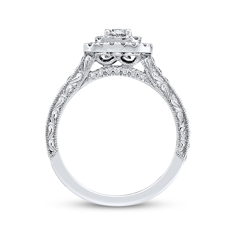 This astonishing engagement ring from Neil Lane Bridal® is set apart by layers of round diamonds radiating from the center. Shimmering diamonds and milgrain detailing adorn the band, and vintage-inspired intricate designs decorate the profile. The 14K white gold ring has a total diamond weight of 7/8 carat.