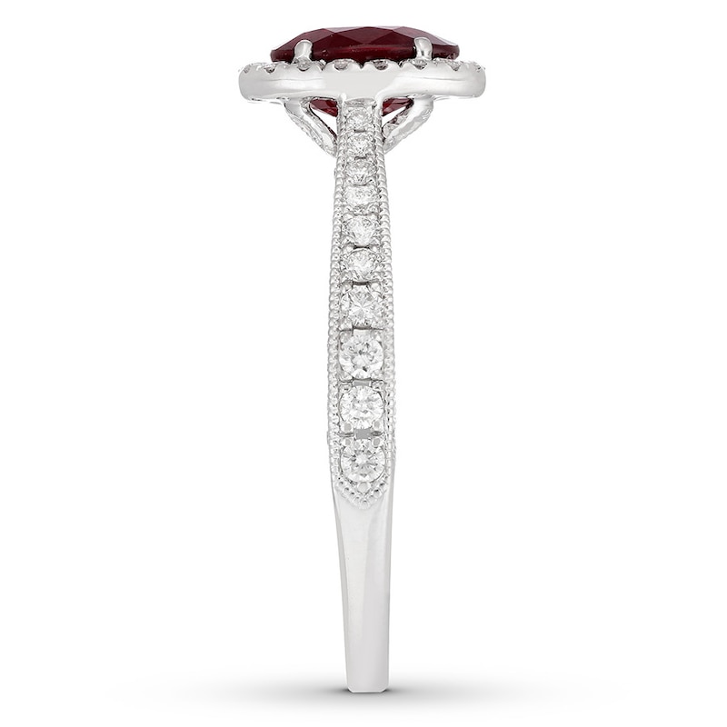 A simple yet detailed design is elevated with a captivating oval natural ruby in this stunning engagement ring from Neil Lane™. Round diamonds line the side and top of the band and halo the center for gorgeous brilliance. Delicate milgrain beading completes the look. Crafted of 14K white gold, the ring has a total diamond weight of 1/2 carat.
