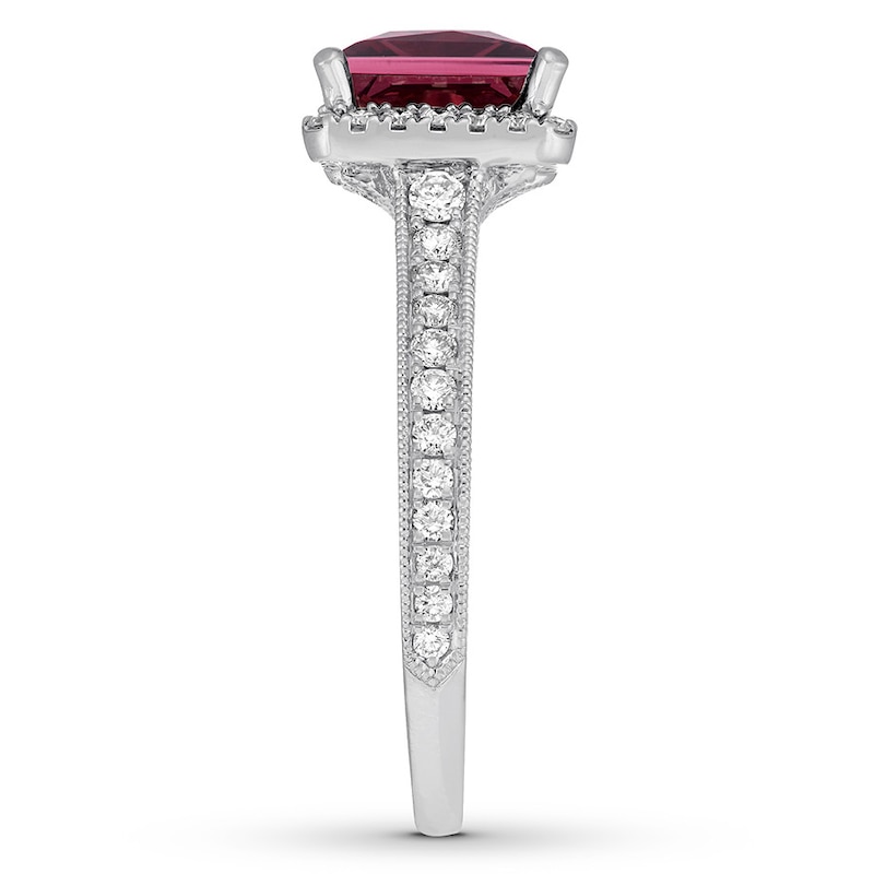 A square-cut rhodolite garnet takes the spotlight in this captivating engagement ring from Neil Lane Studio. Framing the center and lining the 14K white gold band are twinkling round diamonds that total 5/8 carat in weight. Milgrain edging completes the look.