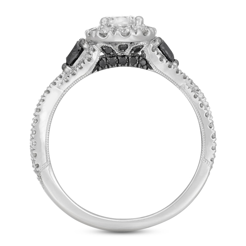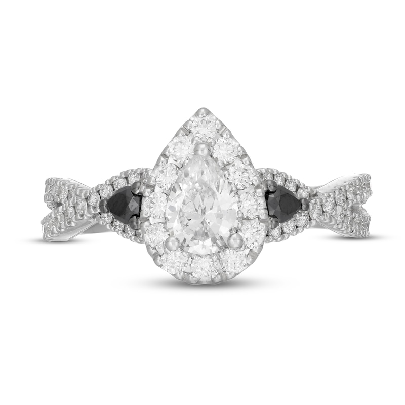 A gorgeous 1/2-carat pear-shaped diamond surrounded by round diamonds draws the eye to this magnificent engagement ring from Neil Lane Bridal®. Two pear-shaped black diamonds glitter at either flank, and round black diamonds set in black rhodium adorn the gallery and the bridge. More round diamonds shimmer down the twisting 14K white gold band for a total diamond weight of 1 1/8 carats. Black rhodium details and milgrain accents complete the look.