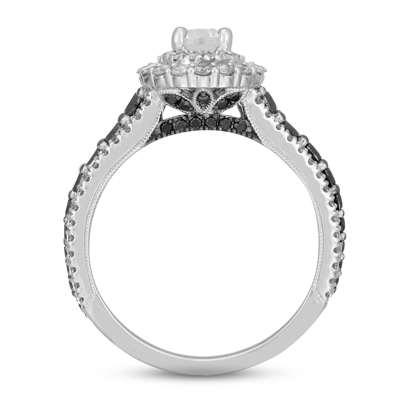 Timeless yet modern, this stunning engagement ring from Neil Lane Bridal® showcases a 1/2-carat pear-shaped diamond surrounded by radiant round diamonds. A row of striking round-cut black diamonds glitter down the band, framed above and below by round diamonds. More round black diamonds sparkle in black rhodium at the gallery and the bridge, adding a unique hidden detail. Styled in 14K white gold, the ring has a total diamond weight of 1 3/4 carats.