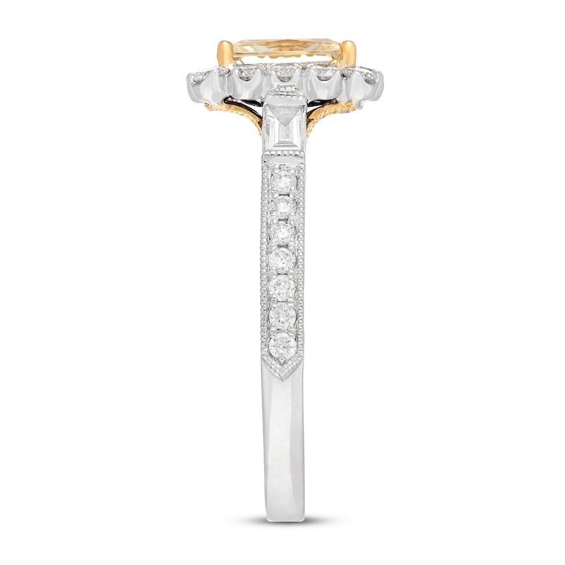 This beautiful engagement ring from the Neil Lane Bridal® collection features a 1-carat radiant-cut natural yellow diamond set in 14K yellow gold and traced in sparkling white diamonds set in 14K white gold. Shining baguette and round diamonds line the band, bringing the total diamond weight to 1 3/4 carats. The center diamond is independently certified and Gemscribe® laser-inscribed.
