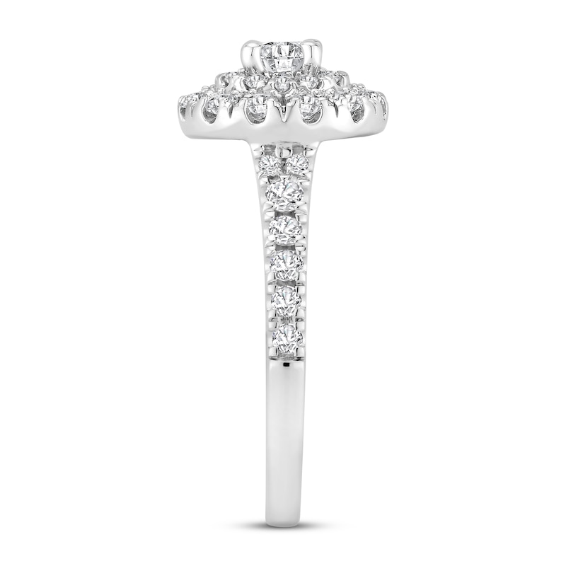 This enthralling engagement ring showcases a dazzling round center diamond surrounded by a double-halo of radiant round diamonds. Round diamonds sparkle down the beautiful 14K white gold band for a total diamond weight of 1 carat. From the Now and Forever® bridal collection.