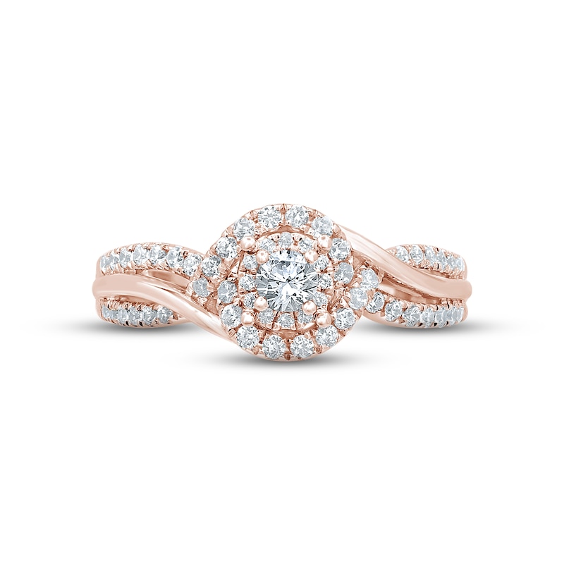 A luminous round diamond is haloed in sparkling ribbons of round diamonds on this splendid engagement ring for her. Sweeping down the band, the diamonds intertwine with smooth swirls of 14K rose gold. The ring has a total diamond weight of 3/8 carat and is from the Now & Forever® bridal collection.