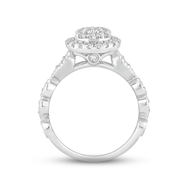 This dazzling engagement ring showcases a teardrop-shaped center comprised of sparkling round-cut diamonds. Round diamonds trace the center, and more shimmer down the contoured band, complemented by classic milgrain detailing. A bezel-set round diamond twinkles at either gallery, giving the 14K white gold ring a total diamond weight of 3/4 carat. From the Now and Forever® bridal collection.