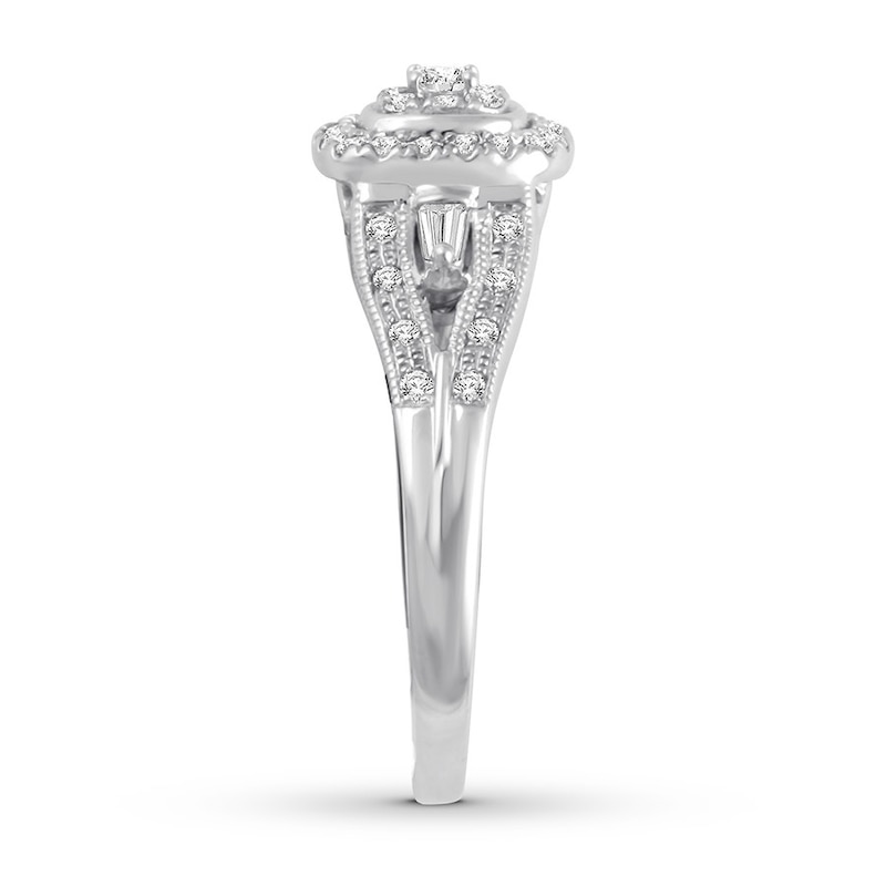 This sparkling engagement ring showcases a princess-cut diamond framed by a host of round diamonds. A baguette diamond decorates each side of the center, while milgrain detail and more round diamonds decorate the split-shank band. The ring is crafted of 10K white gold and has a total diamond weight of 1/2 carat.