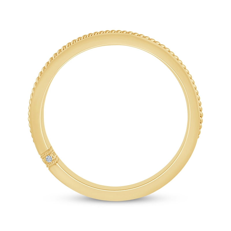 - A signature element of white diamonds in milgrain detailing encircles the band, symbolizing unity and eternal love