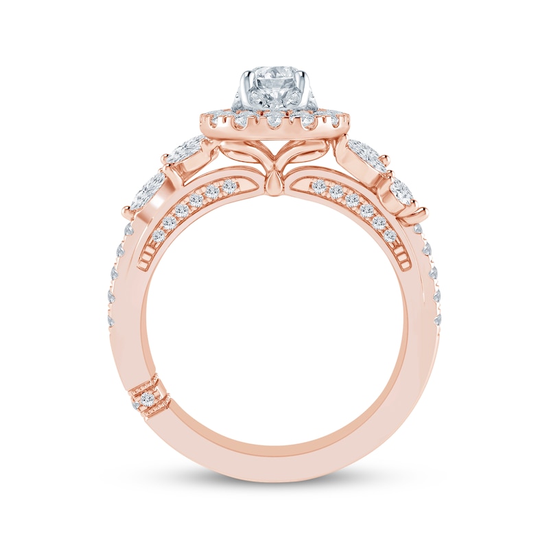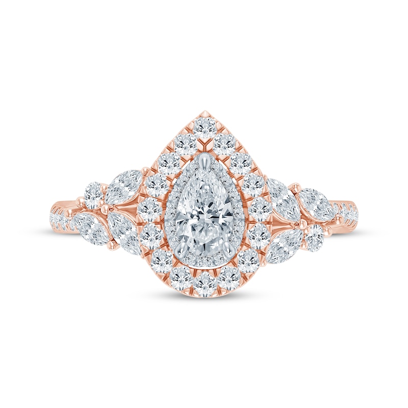 - The 1/3-carat pear-shaped diamond center shimmers in a halo of round-cut diamonds in 18K white gold and a second halo in 18K rose gold