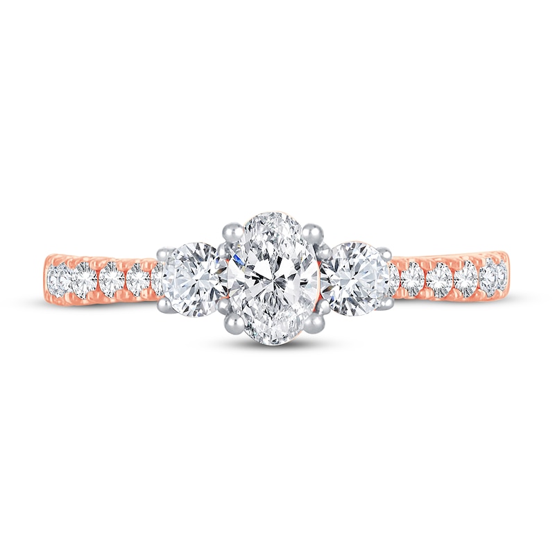 This beautiful three-stone engagement ring for her features a stunning oval-cut diamond, flanked by two brilliant round-cut diamonds. More round diamonds sparkle down each side of the 14K rose gold band for a total diamond weight of 1 carat. From the Now & Forever® bridal collection.