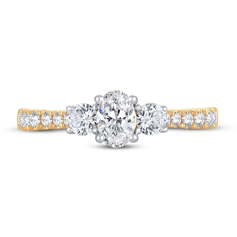 This beautiful three-stone engagement ring for her features a stunning oval-cut diamond, flanked by two brilliant round-cut diamonds. More round diamonds sparkle down each side of the 14K yellow gold band for a total diamond weight of 1 carat. From the Now & Forever® bridal collection.