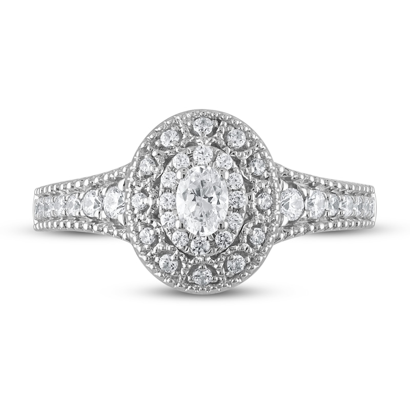 This enchanting engagement ring for her is from the Now & Forever® Bridal Collection and features a stunning oval-cut diamond that is surrounded by two sparkling halos of round diamonds. The band, designed with beautiful milgrain detailing, has additional dazzling diamonds to complete the look. Fashioned from 14K white gold, this ring has a total diamond weight of 1/2 carat.