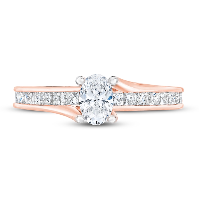 This stunning diamond engagement ring showcases a 1/2 carat oval-cut diamond at its center. Channel-set princess-cut diamonds sparkle down the 14K rose gold band, giving the ring a total diamond weight of 1 carat. From the Now & Forever® bridal collection.