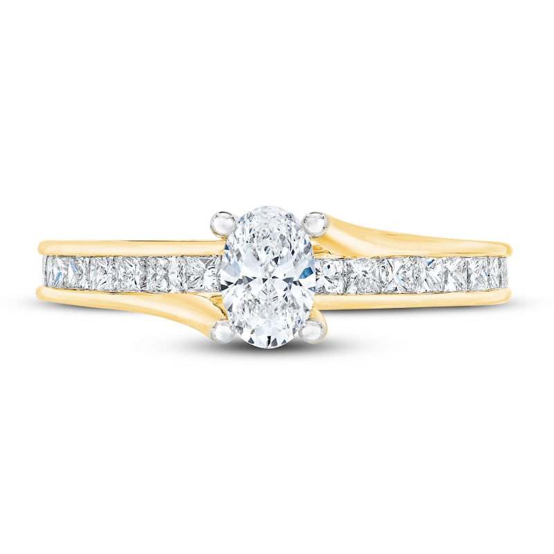 This stunning diamond engagement ring showcases a 1/2 carat oval-cut diamond at its center. Channel-set princess-cut diamonds sparkle down the 14K yellow gold band, giving the ring a total diamond weight of 1 carat. From the Now & Forever® bridal collection.