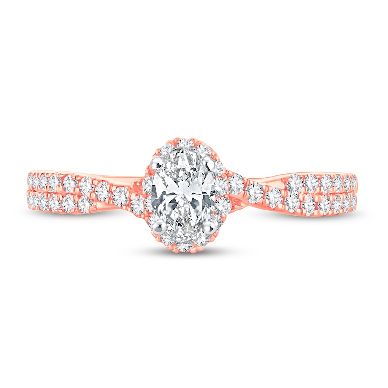 A gorgeous oval-cut diamond sparkles at the center of this engagement ring for her. Brilliant round-cut diamonds halo the center, and more flow down the twisted band for a total diamond weight of 3/4 carat. The ring is fashioned in dreamy 14K rose gold. From the Now & Forever® bridal collection.