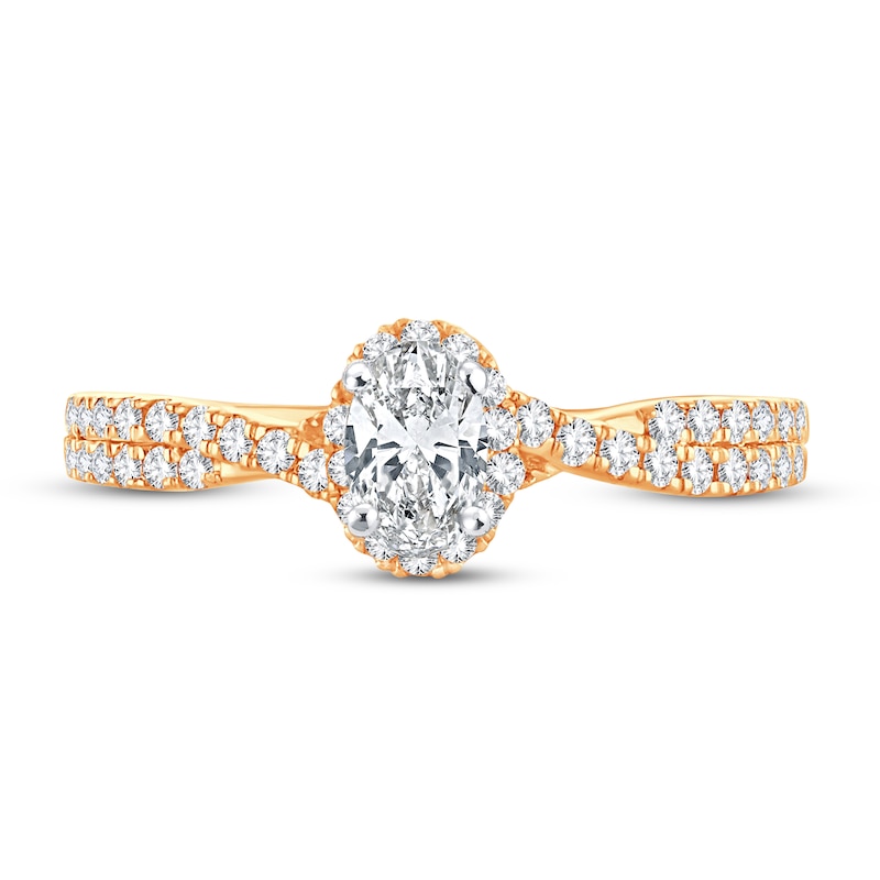 A gorgeous oval-cut diamond sparkles at the center of this engagement ring for her. Brilliant round-cut diamonds halo the center, and more flow down the twisted band for a total diamond weight of 3/4 carat. The ring is fashioned in classic 14K yellow gold. From the Now & Forever® bridal collection.