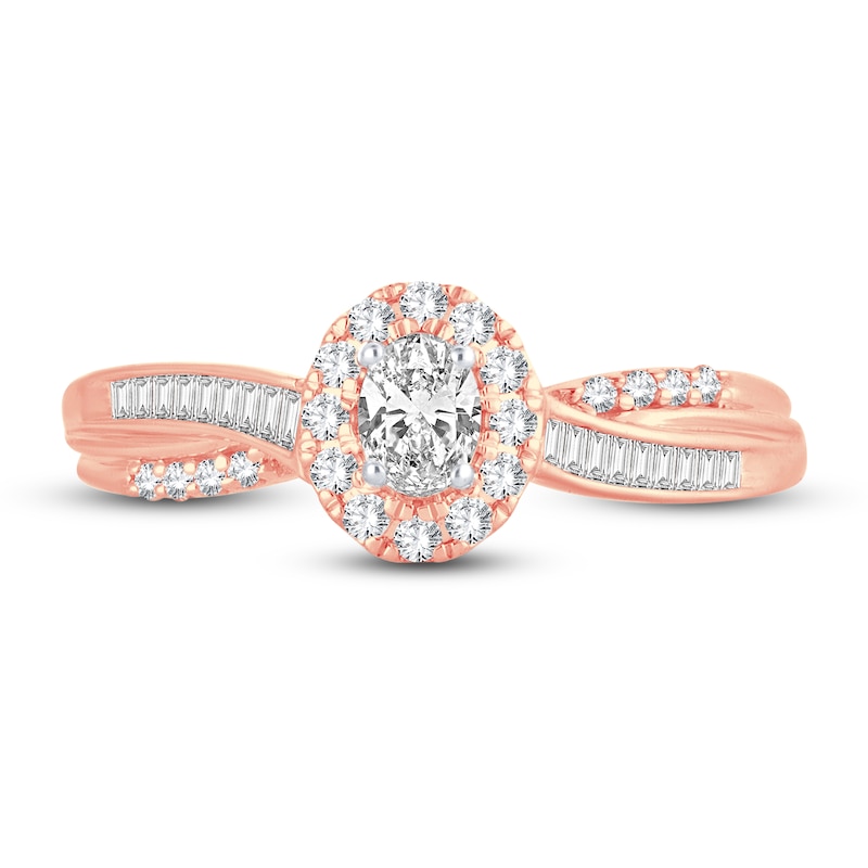 Chic and sophisticated, this engagement ring showcases a beautiful oval-cut diamond at its center, haloed by brilliant round diamonds. Sweeps of baguette-cut and round-cut diamonds shimmer along the band for a total diamond weight of 3/8 carat. The ring is crafted in dreamy 14K rose gold. From the Now & Forever® bridal collection.