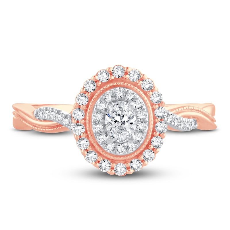 This chic engagement ring shines with a beautiful oval-cut diamond at its center, surrounded by a double halo of round-cut diamonds. More round diamonds and milgrain detailing twist down the band, totaling 3/8 carat in weight. The ring is crafted in dreamy 14K rose gold. From the Now & Forever® bridal collection.