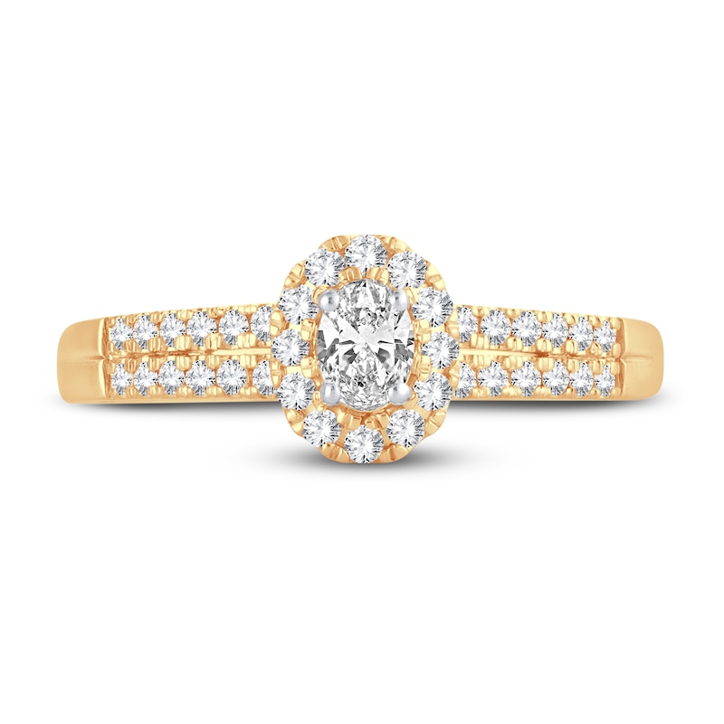 A breathtaking oval-cut diamond sparkles at the center of this elegant engagement ring for her. Set in timeless 14K yellow gold, brilliant round diamonds halo the center stone and shimmer down the band in dual rows. The ring has a total diamond weight of 3/8 carat. From the Now & Forever® bridal collection.