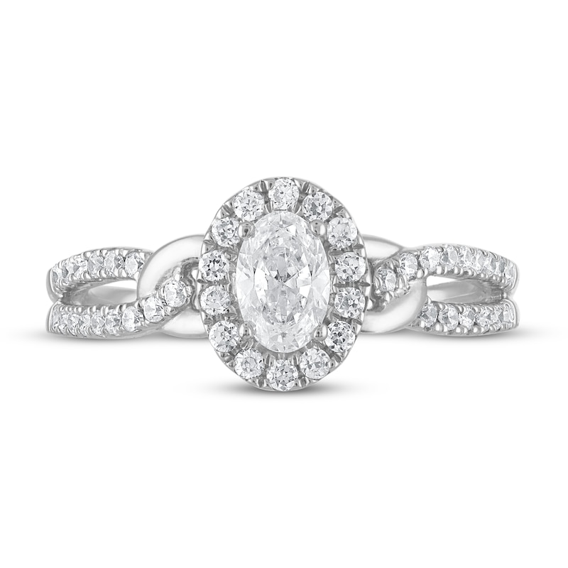 This breathtaking engagement ring for her is from the Now & Forever® Bridal Collection and features a gorgeous oval-cut diamond that shines brightly inside a halo of dazzling round diamonds. The band is further enhanced with interlocking curves with round diamonds. Crafted from 14K white gold, the total diamond weight is 5/8 carat.