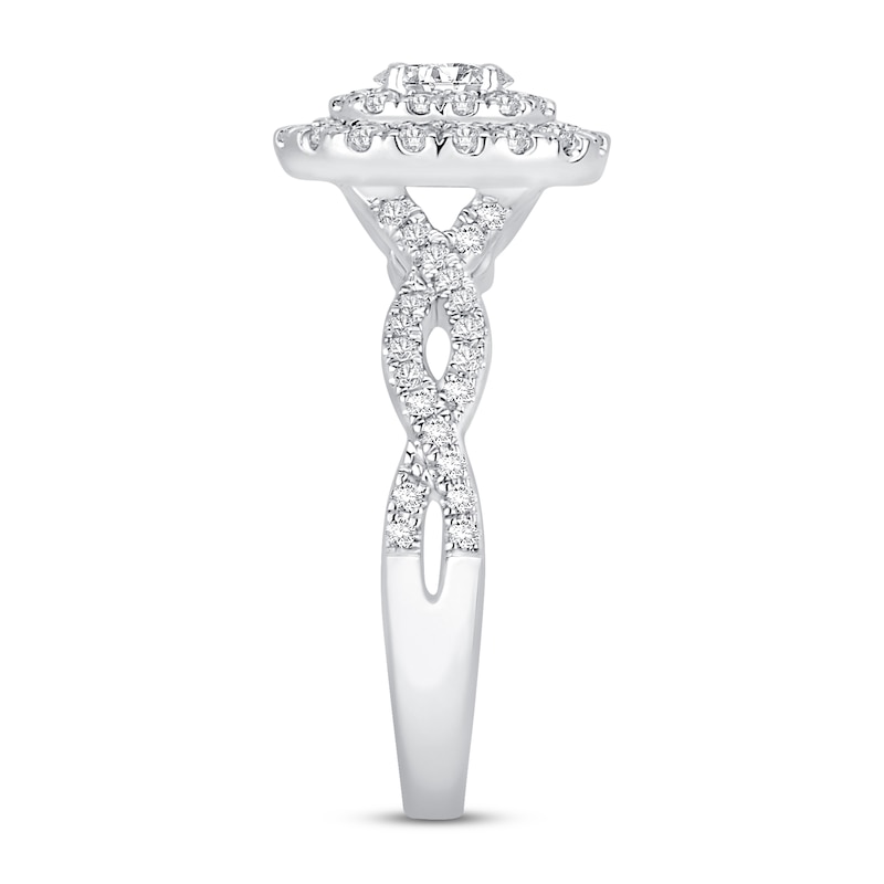 This captivating women's engagement ring features an oval-shaped diamond center haloed by brilliant round diamonds. Fashioned in 14K white gold, the ring has a total diamond weight of 5/8 carat. From the Now & Forever® bridal collection.