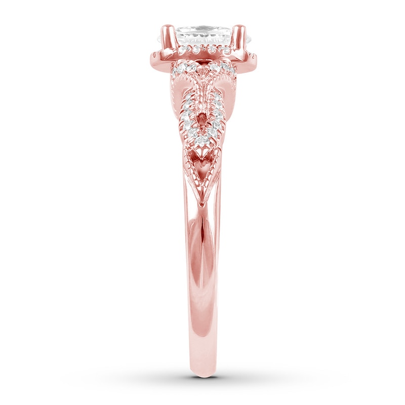 This vintage-inspired engagement ring exudes a timeless elegance with a design that still feels fresh and modern. The brilliant 3/4-carat oval-shaped center diamond is set in 14K rose gold with a shimmering frame of round diamonds below. Tapered curves of sparkling diamonds and delicate milgrain complete the look. The ring has a total diamond weight of 7/8 carat. From the Now & Forever® Bridal Collection.
