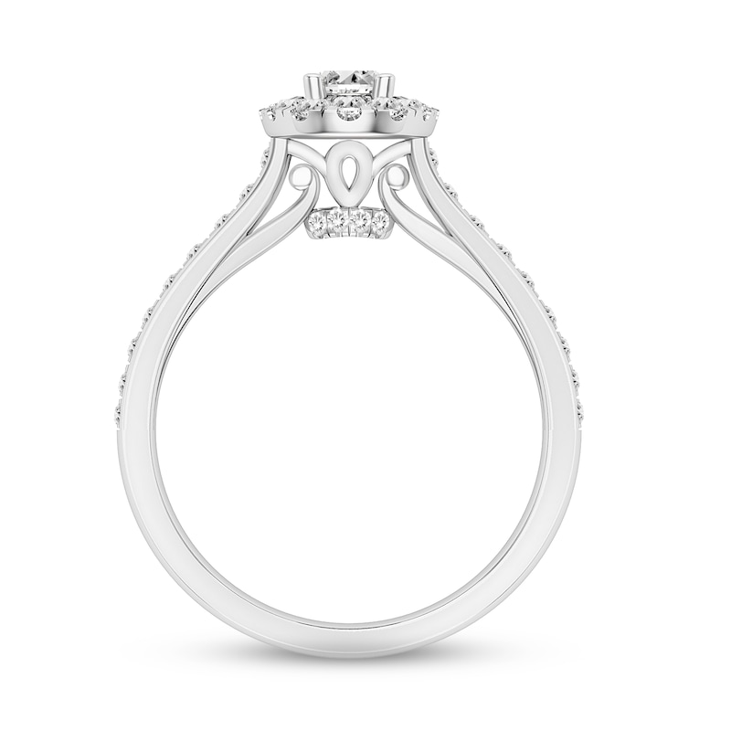 This exceptional engagement ring displays a stunning 1/2-carat oval-cut diamond haloed by shimmering round diamonds at the center. More round diamonds sparkle along the band, which is crafted in 14K white gold, for a total diamond weight of 1 carat. From the Now & Forever® bridal collection.
