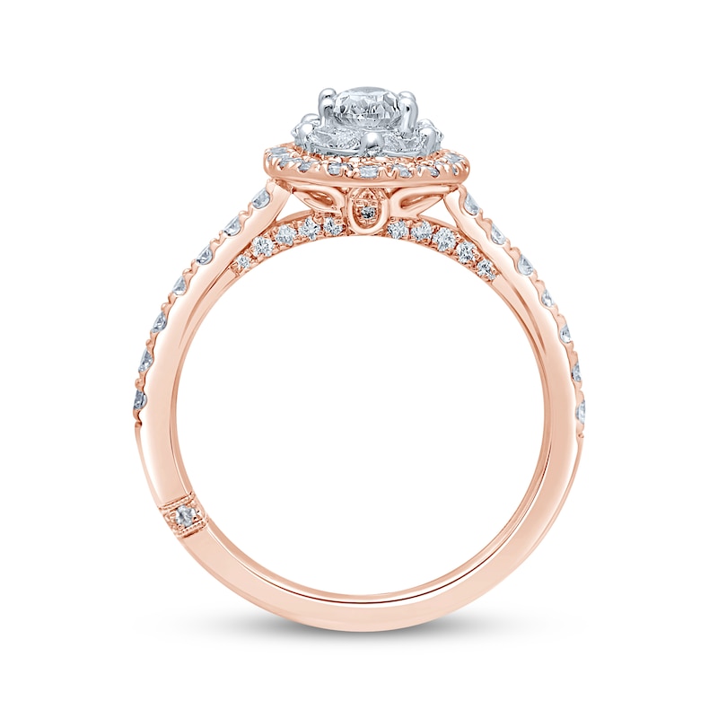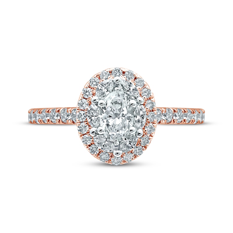 This luxe engagement ring showcases a 1/2-carat independently-certified oval-cut diamond at its center. Gorgeous marquise-cut diamonds halo the center, set in complementary 18K white gold prongs. The 18K rose gold ring sparkles with another frame of diamonds to finish the center design. More round diamonds sparkle under the top and down the band for a total diamond weight of 1 1/4 carats. From the Monique Lhuillier Bliss collection, available exclusively at KAY. Please note: This ring is available in limited sizes. If you don't see your size here, please visit a store to order your ring.