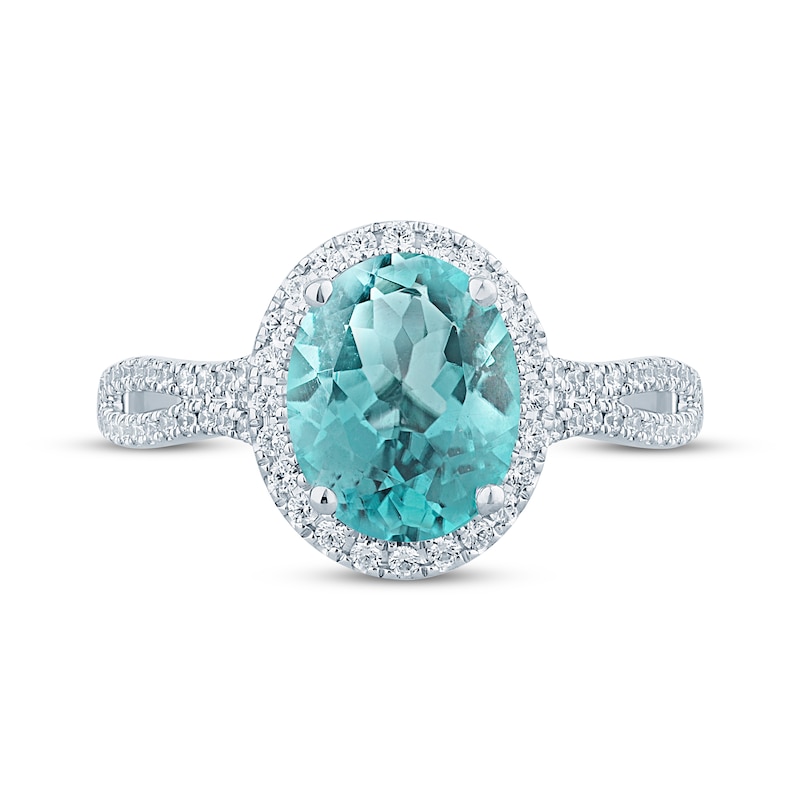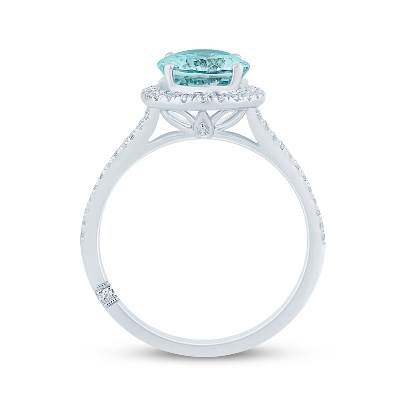 Celebrate your forever love with the joyous blue hue of this aquamarine and diamond engagement ring. This exceptional style is crafted in 14K white gold. A cool oval-cut aquamarine glistens at the center, haloed by shimmering round-cut diamonds. Two gently curving rows of round diamonds meet along the split shank, giving the ring a total diamond weight of 1/3 carat. A signature element of diamonds in milgrain detailing encircles the band, symbolizing unity and eternal love. From the Monique Lhuillier Bliss collection, available exclusively at KAY. Please note: This ring is available in limited sizes. If you don't see your size here, please visit a store to order your ring.
