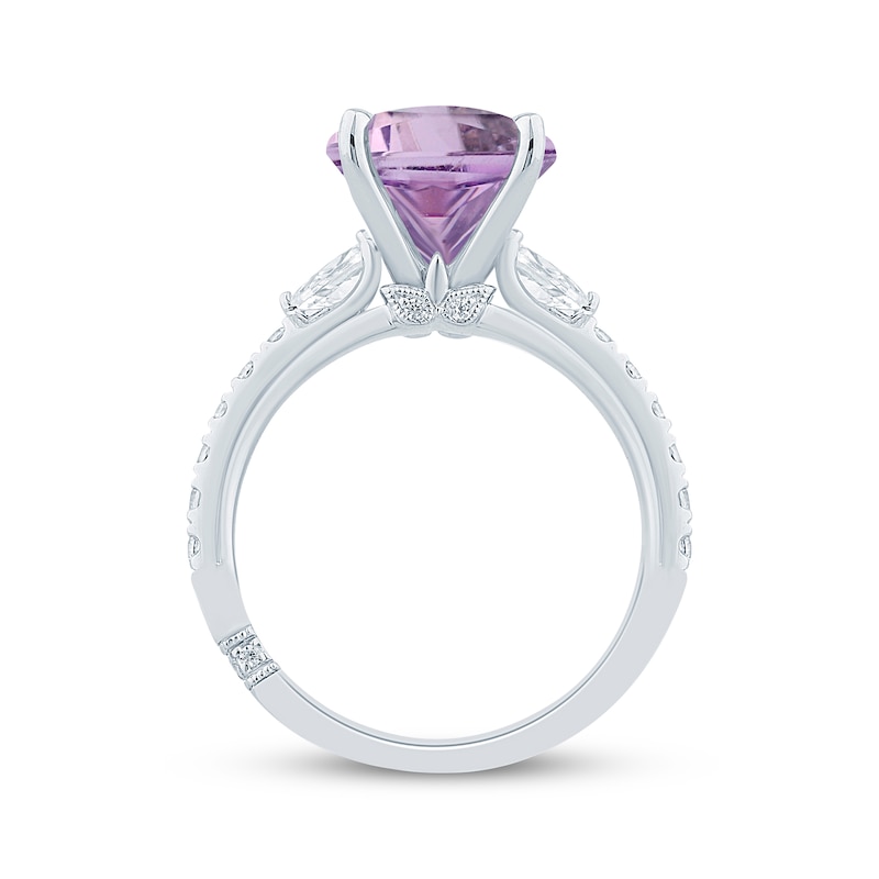 A breathtaking symbol of romance, this light amethyst and diamond engagement ring is the one she's been waiting for. A colorful oval-cut light amethyst creates an alluring focal point, flanked by a pear-shaped diamond on each side. Radiant round-cut diamonds grace the shank and gallery, while a signature element of diamonds in milgrain detailing encircles the band, symbolizing unity and eternal love. The ring is crafted in 14K white gold and has a total diamond weight of 1/2 carat. From the Monique Lhuillier Bliss collection, available exclusively at KAY. Please note: This ring is available in limited sizes. If you don't see your size here, please visit a store to order your ring.