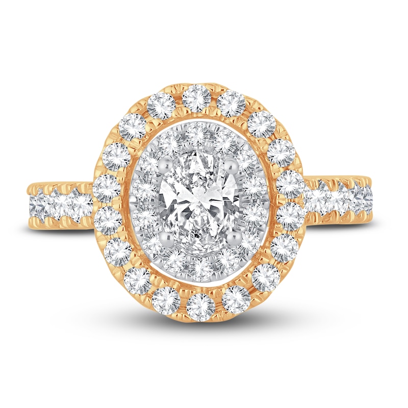 They'll be swept away (and say YES!) with the breathtaking sparkle of this diamond engagement ring. An exquisite oval-cut diamond forms a remarkable focal point when embraced with duo halos of shimmering round-cut diamonds. For a delightful finish, extra round diamonds adorn the polished 14K yellow gold band. The ring has a total diamond weight of 1 1/2 carats and is from our Now & Forever® bridal collection.