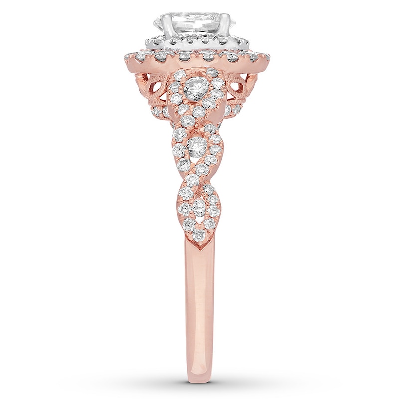 Neil Lane Bridal® rings feature modern, vintage-inspired designs that celebrate Hollywood glamour. This engagement ring showcases a 1/2 carat oval diamond, set in 14K white gold, as the brilliant center of attention. Sparkling round diamonds encircle the center and beautifully decorate the band of 14K rose gold. The ring has a total diamond weight of 1 1/6 carats.