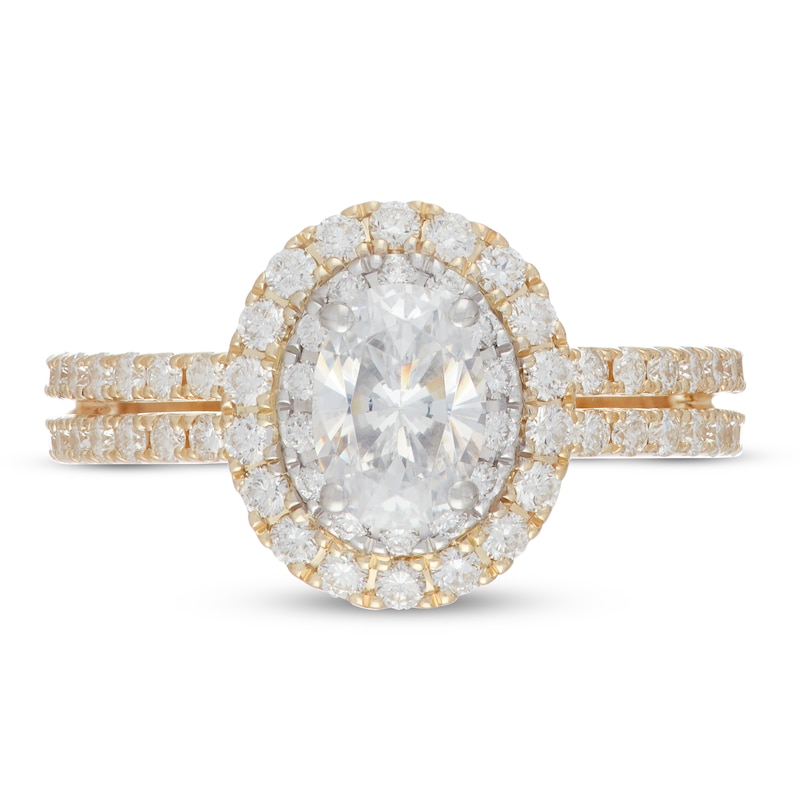A stunning 1 carat oval-shaped diamond shines at the center of this engagement ring for her. A beautiful halo of round diamonds sparkles in 14K white gold for a classic look. Another halo of round diamonds set in 14K yellow gold frames the center, and additional round diamonds beam down each side of the 14K yellow gold band. The ring has a total diamond weight of 1 3/4 carats. From the Neil Lane Bridal® collection.