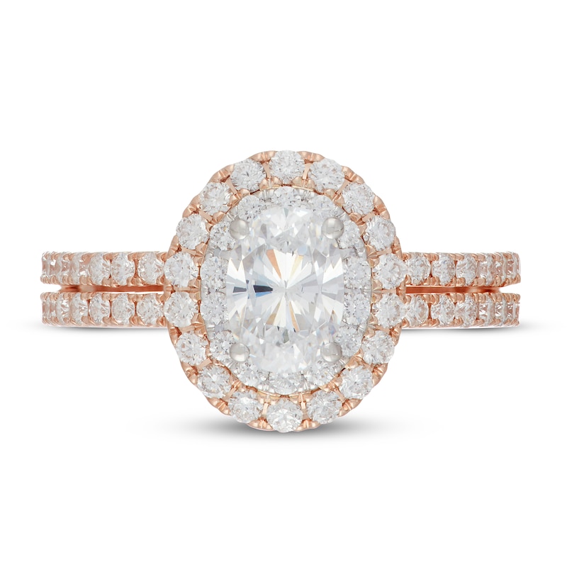 A stunning 1 carat oval-shaped diamond shines at the center of this engagement ring for her. A beautiful halo of round diamonds sparkles in 14K white gold for a classic look. Another halo of round diamonds set in 14K rose gold frames the center, and additional round diamonds beam down each side of the 14K rose gold band. The ring has a total diamond weight of 1 3/4 carats. From the Neil Lane Bridal® collection.