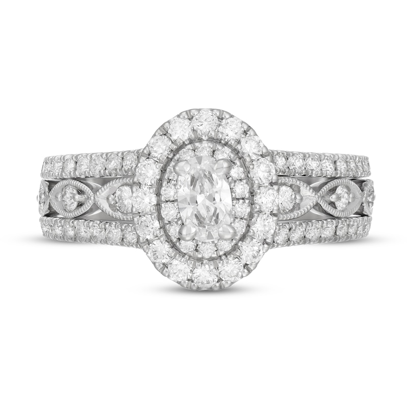 This exquisite engagement ring from Neil Lane Bridal® displays a dazzling oval-cut diamond double-haloed by brilliant round diamonds. More round diamonds sparkle down the 14K white gold band in elegant marquise-shaped settings, complemented by classic milgrain accents. Two outer rows of round diamonds bring the total diamond weight to 1 carat.