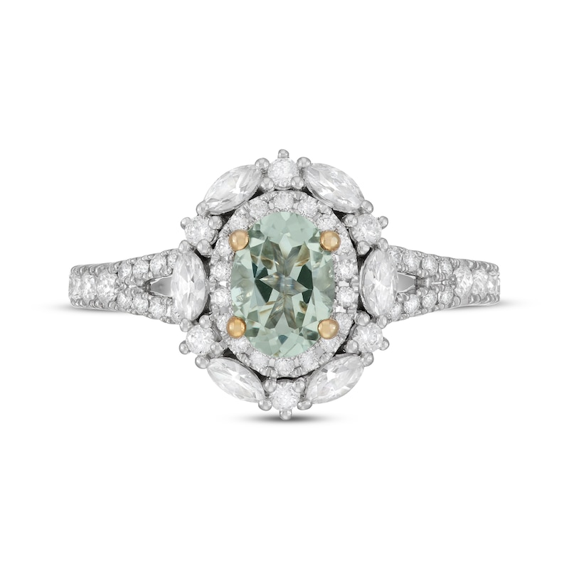 Make your proposal memorable with this dazzling engagement ring. The oval-cut green quartz is elevated with a halo of sparkling round-cut diamonds, and another frame of round- and marquise-cut diamonds. More round-cut diamonds shimmer along the 14K white gold split shank and bridge. Detailed 14K yellow gold prongs and milgrain detailing lend interest to the design. This engagement ring has a total diamond weight of 3/4 carat. From the Neil Lane Bridal® collection.