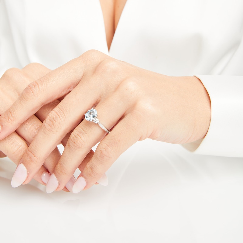 An icy-hued oval-cut aquamarine shines at the center of this stunning engagement ring. Set in iconic 14K white gold, brilliant round diamonds flank the gemstone and shimmer down the sides of the band. The ring has a total diamond weight of 1/3 carat. From the Now & Forever® bridal collection.