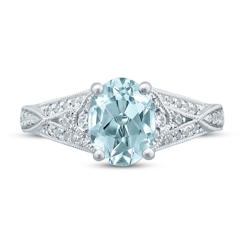An icy oval-cut aquamarine shines at the center of this ethereal engagement ring. Set in iconic 14K white gold, the band sparkles with brilliant round diamonds totaling 1/4 carat in weight. Classic milgrain detailing finishes the stand-out design. From the Now & Forever® bridal collection.