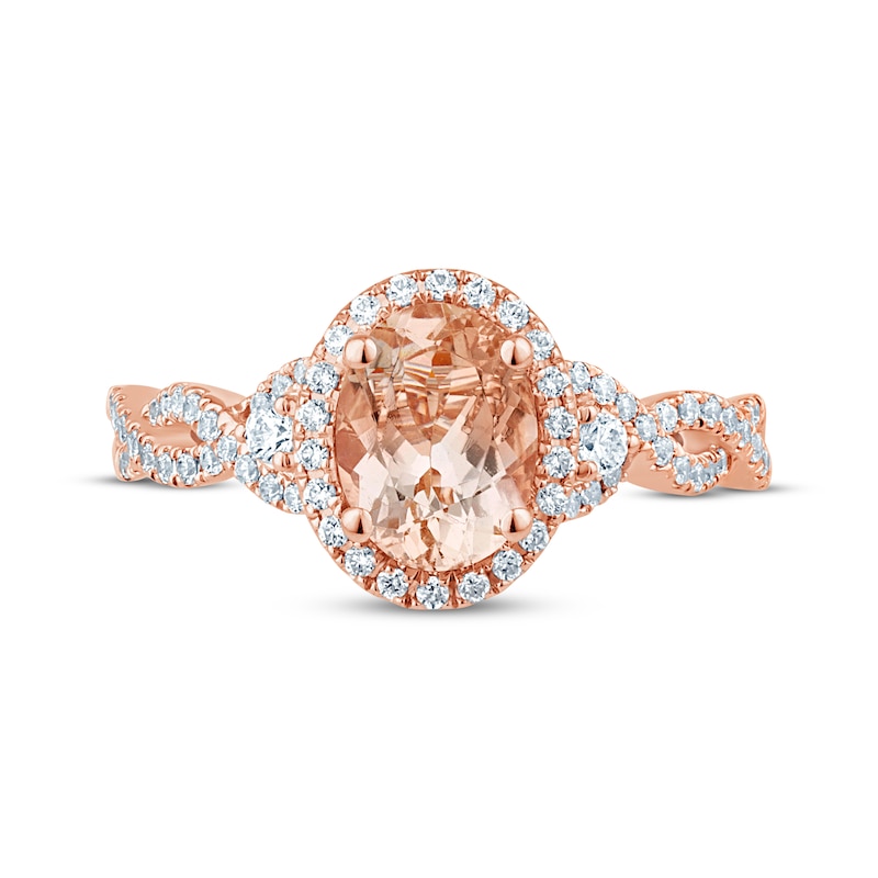 A peachy-pink oval-cut morganite dazzles as the breathtaking focal point of this gorgeous engagement ring. Radiant round diamonds halo the center, sparkle on the flanks and twist down the elegant band. The ring is crafted in romantic 14K rose gold with a high polish finish and has a total diamond weight of 1/3 carat. From the Now & Forever® bridal collection.