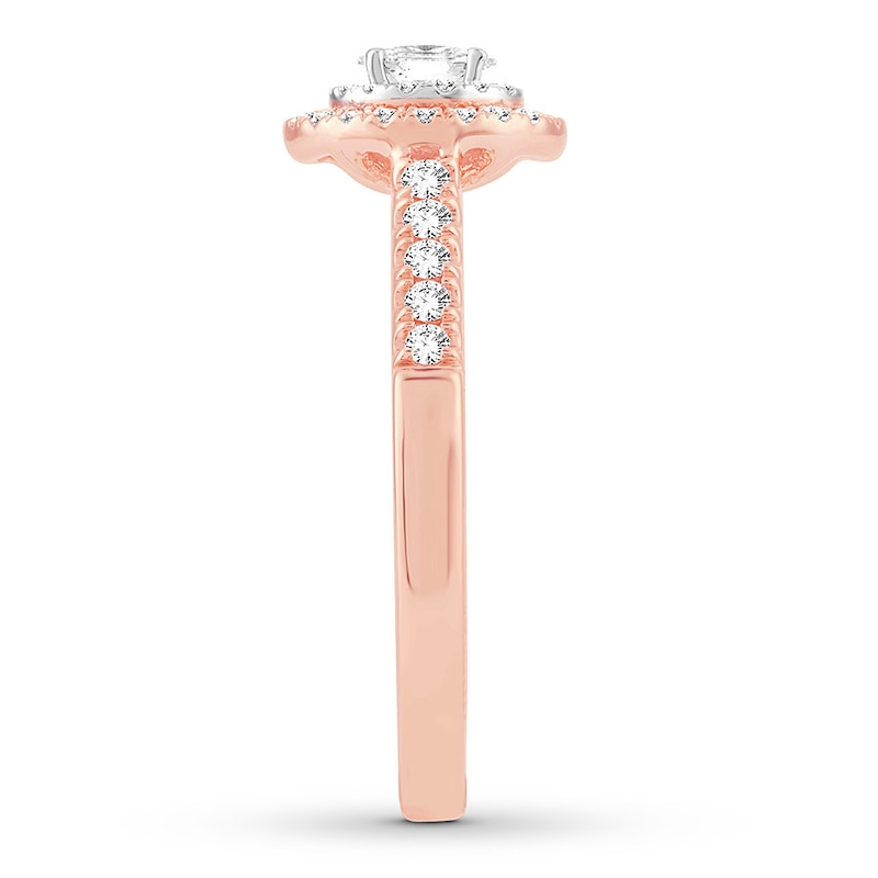 A 1/5-carat oval diamond, haloed in round diamonds, shines at the center of this beautiful engagement ring for her. Round diamonds decorate the 14K rose gold band, bringing the total diamond weight to 1/2 carat.