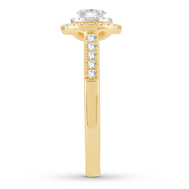 A 1/5-carat oval diamond, haloed in round diamonds, shines at the center of this enchanting engagement ring for her. Round diamonds decorate the 14K yellow gold band, bringing the total diamond weight to 1/2 carat.