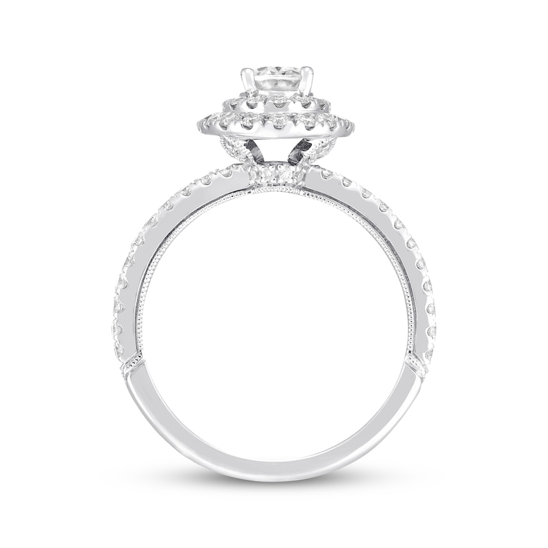 This Neil Lane Bridal® engagement ring embraces the modern beauty of the halo design. The brilliant 1-carat oval-shaped diamond center reflects Neil Lane's passion for vintage designs, while round diamonds add sparkle to the split-shank band. The diamonds total 1 3/4 carats in weight. Available online while supplies last. Previously Owned Treasures are not eligible for in-store pickup. Previously Owned Treasures may only be shipped either to your home address or to an alternate address.