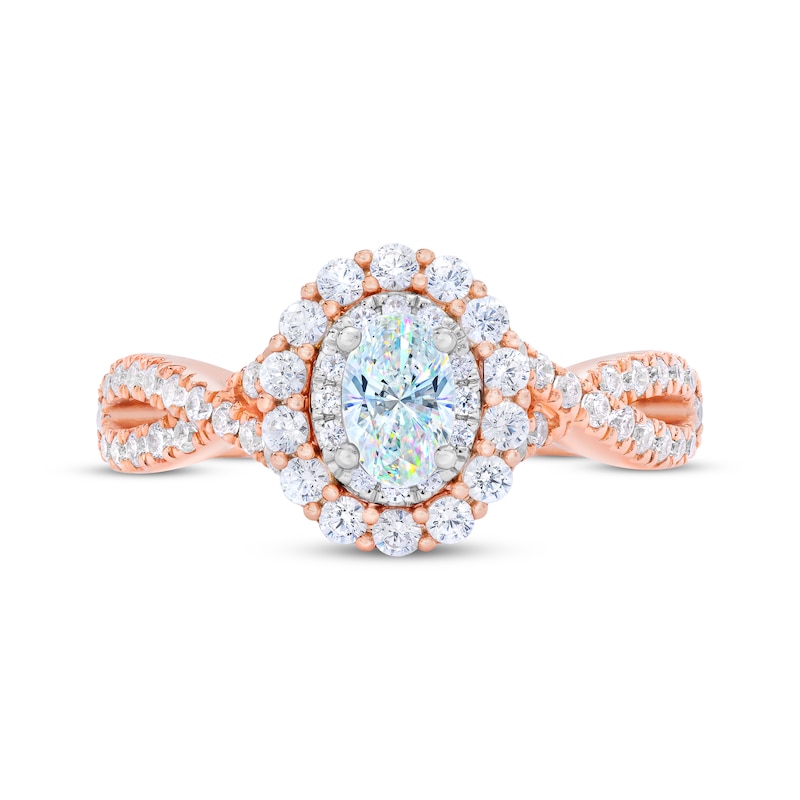 - In romantic 14K rose gold, more round diamonds form an outer halo and twist down the elegant shank