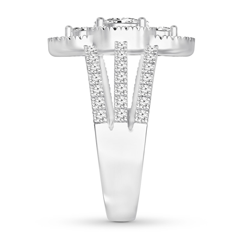 Inspired by popular three-stone ring designs, this extraordinary engagement ring features a vertical design with three distinct sections, each decorated in princess, round and marquise diamonds. The ring's framework shimmers with more round diamonds, bringing the total diamond weight to 1 1/3 carats.