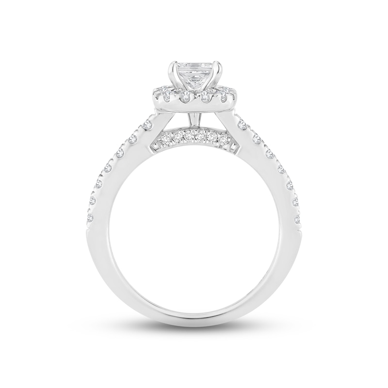 A dazzling 5/8-carat princess-cut diamond is framed in shining round diamonds at the center of this gorgeous engagement ring for her. Additional round diamonds shimmer halfway down the band and sparkle across the bridge for extra allure. The ring is styled in iconic 14K white gold and has a total diamond weight of 1 1/6 carats. From our Now and Forever® bridal collection.