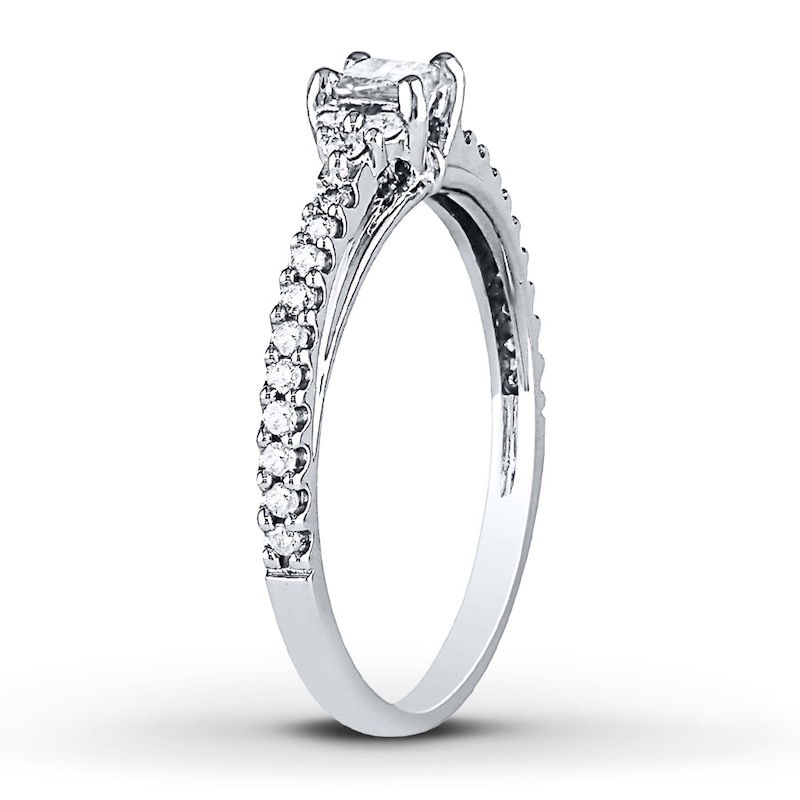 A row of dazzling round diamonds is topped with a dramatic princess-cut diamond in this thrilling engagement ring for her. Crafted in lustrous 10K white gold, the ring has a total diamond weight of 1/2 carat.