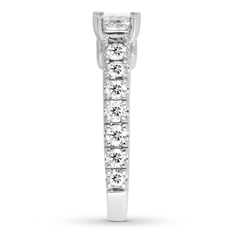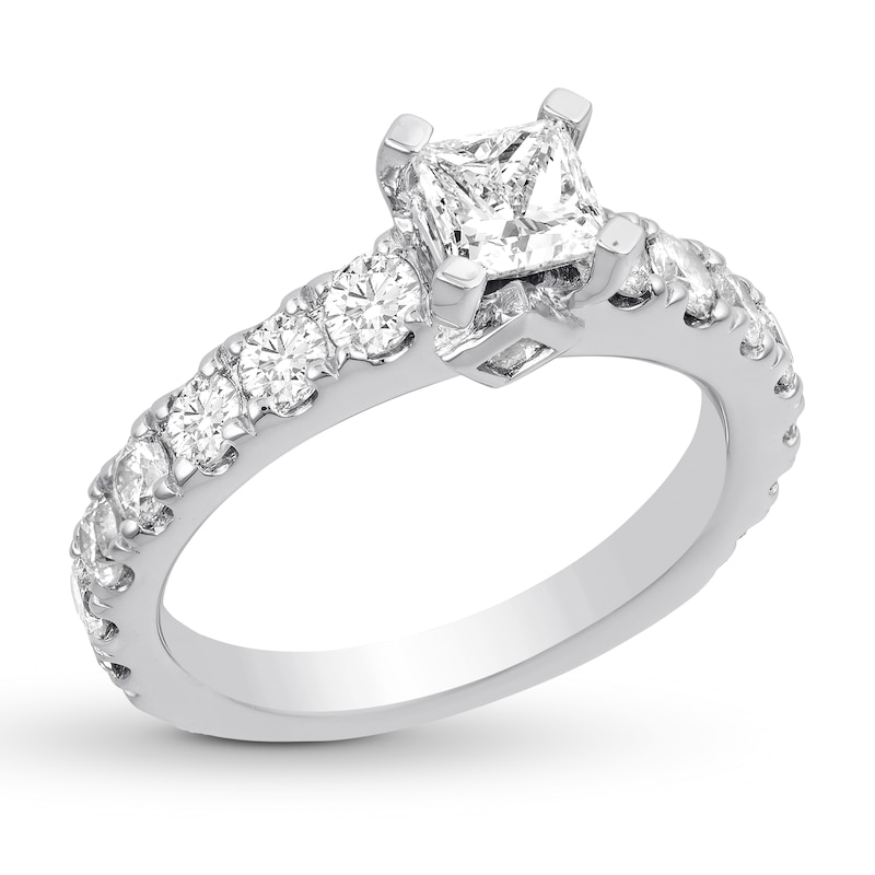 A princess-cut diamond shouts your love loud and clear in this extraordinary engagement ring. Brilliant round diamonds along the band are a breathtaking added touch. Styled in 14K white gold, the ring has a total diamond weight of 2 carats.