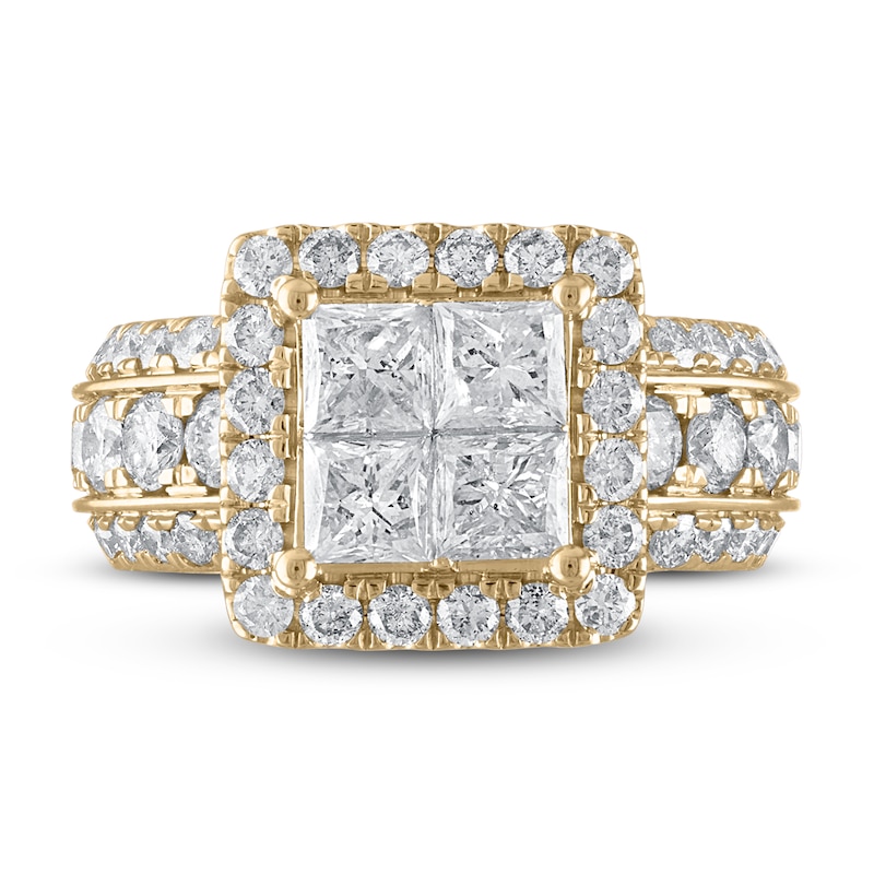 Four gorgeous princess-cut diamonds form the center of this stunning engagement ring for her. A bold halo of round diamonds frames the center, and three rows of sparkling round diamonds line each side of the band. The 14K yellow gold ring has a total diamond weight of 4 carats. From the Now & Forever® bridal collection.