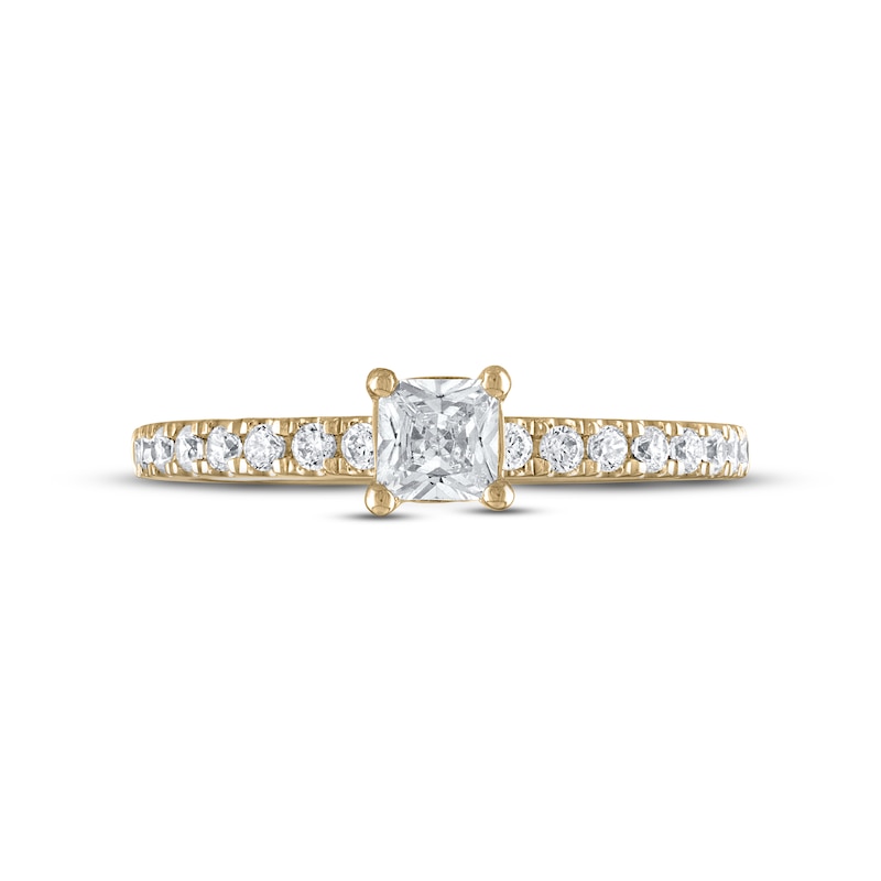 A gorgeous 1/2-carat princess-cut diamond shines as the centerpiece of this alluring engagement ring for her. Round diamonds shimmer down the 14K yellow gold band, giving the ring a total diamond weight of 5/8 carat. From the Now and Forever® bridal collection.